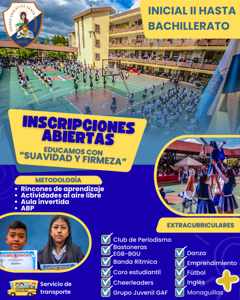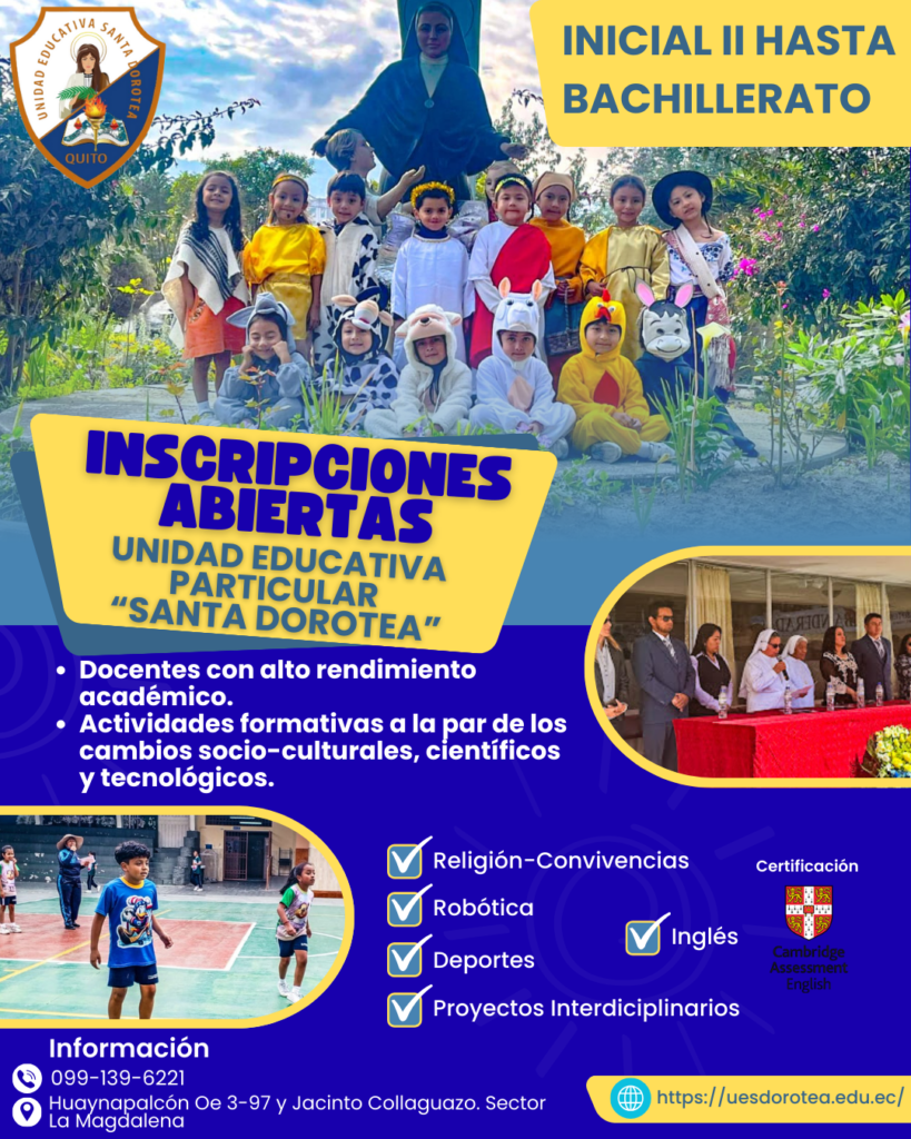 INSCRIPCIONES ABIERTAS AÑO LECTIVO 2026-2027Por uesdorotea.edu.ec / 27 enero, 2026 / Deja un comentario / Unidad Educativa Santa Dorotea Desde este,26 de enero, recibimos con alegría a todos nuestros futuros estudiantes. ¡Bienvenidos a este nuevo ciclo de aprendizaje y crecimiento! No dejes pasar la oportunidad de formar parte de nuestra comunidad.